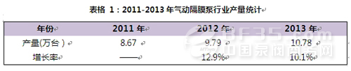 水泵行業是典型的投資拉動型產業,市場需求受國家宏觀政策,特別是受水利、建筑、能源等行業的宏觀政策影響很大。“十二五”期間我國泵設備制造業將保持20%左右的市場增長速度,到2015年的銷售規模將在1587億元左右。到近年來,我國氣動隔膜泵產量逐年上升,到2013年氣動隔膜泵的產量達10.78萬臺。隨著市場發展,行業發展前景廣闊,預計2018年,行業產量將達到18.09萬臺。