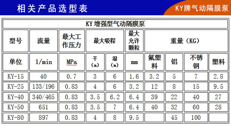2)、KY型氣動隔膜泵整體構造上更加優化,泵腔和主管路都有明顯加強,自吸功能和流量揚程都有很大改善(最大流量53立方/小時,最大揚程83米);被客戶成為超大流量氣動隔膜泵和壓濾機專用氣動隔膜泵。