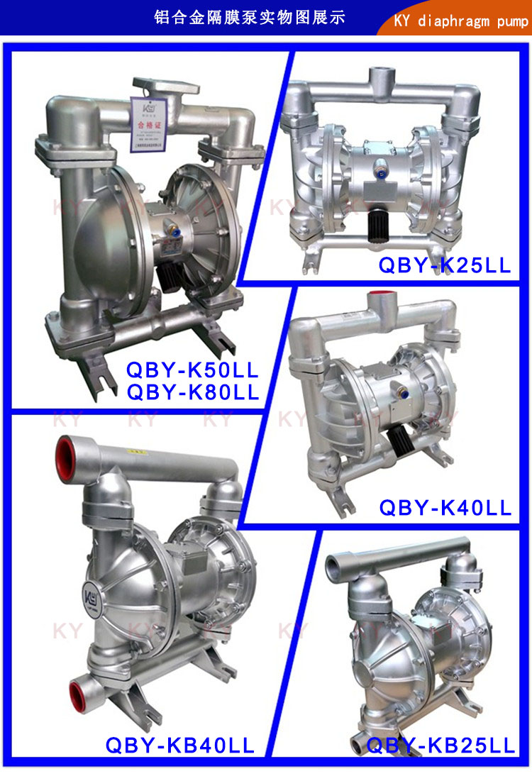 QBY-K40LL鋁合金氣動隔膜泵是第四代氣動隔膜泵,它以壓縮空氣為動力;左右兩個泵腔分別裝有彈性隔膜,因此又稱氣動雙隔膜泵。當壓縮氣體進入中間馬達體,馬達體會將壓縮氣體壓入隔膜泵其中一腔從而推動隔膜片運動擠壓液體流出,同時隔膜泵的另一腔因為被拉出而吸入液體。當隔膜片到達終點,配氣閥機構自動將壓縮空氣引入泵腔另一端,推動隔膜片朝相反方向運動,從而使雙隔膜片在泵體的兩個腔做往復運動,抽動液體流動。上海楷陽為方便客戶使用,第四代QBY-K40氣動隔膜泵已經研發了十余種材質生產:鑄鐵氣動雙隔膜泵、鋁合金氣動隔膜泵、不銹鋼304氣動雙隔膜泵、不銹鋼316L氣動雙隔膜泵、工程塑料(增強聚丙烯)氣動隔膜泵、氟塑料(PVDF)氣動隔膜泵和耐腐蝕抗壓性能超強的鋼襯氟氣動雙隔膜泵等。