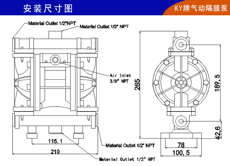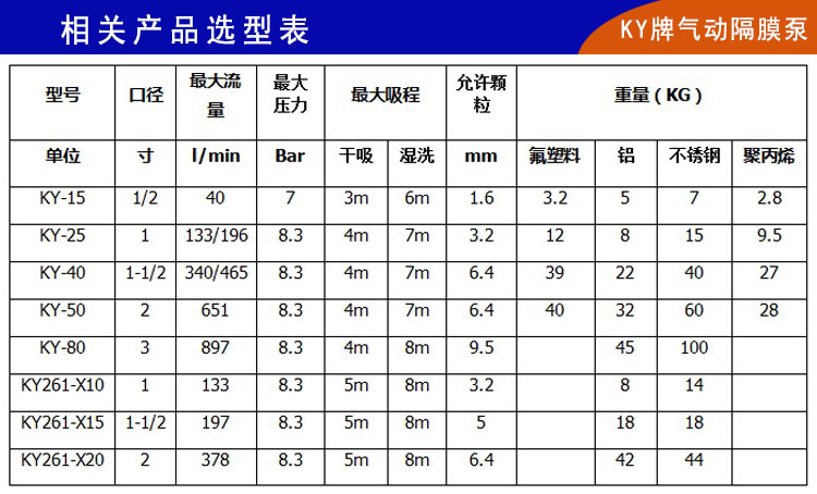 9、KY型工程塑料氣動隔膜泵整體構(gòu)造上更加優(yōu)化,泵腔和主管路都有明顯加強,自吸功能和流量揚程都有很大改善(最大流量/54立方/小時,最大揚程80米);被客戶成為超大流量氣動隔膜泵和壓濾機專用氣動隔膜泵。