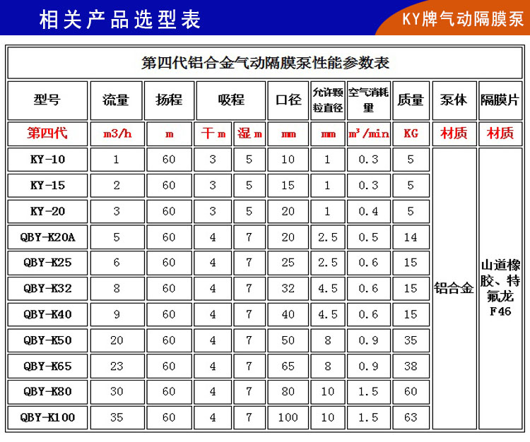 楷陽氣動雙隔膜泵鑄件全部數控加工,主膜片采用特氟龍F46和進口特氟龍,副膜片使用山道橡膠和彈性橡膠,替代了常用的四氟和普通橡膠等劣質易損件;密封球和密封座采用特氟龍F4和山道橡膠;從而大大增加了QBYK25氣動隔膜泵易損件的使用壽命。QBY-K鋁合金氣動雙隔膜泵配氣裝置內置一體化,做到了真正的不卡氣、無死機,外觀更加美觀大方;空氣利用率大大提高,自吸功能和流量揚程都有很大改善。